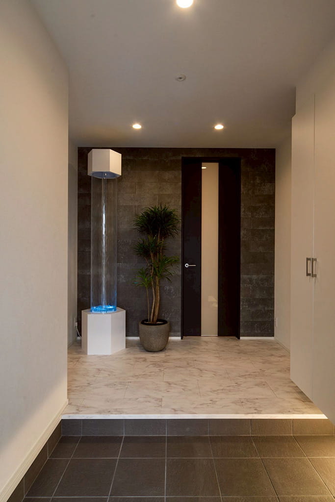 玄関には、アクアウォールポールと石彫の壁面を設え、訪れる人を非日常へと誘う演出に。