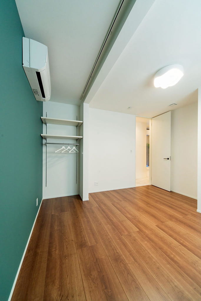 床には温かみのある木目を採用し、モノトーンを基調としたインテリアにやわらかな表情を添えた。