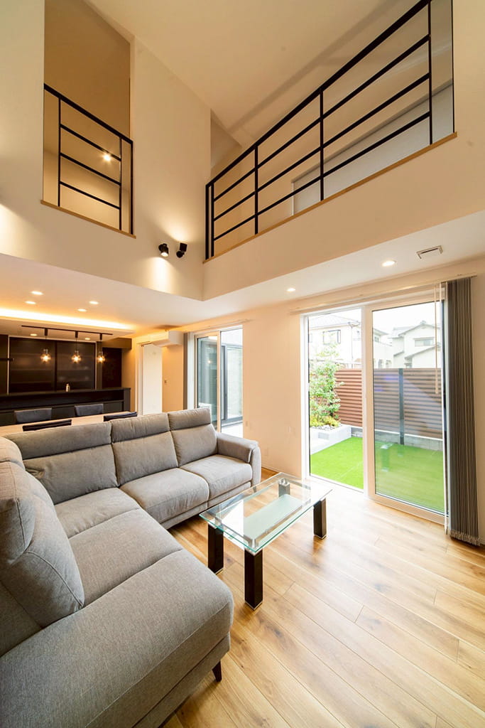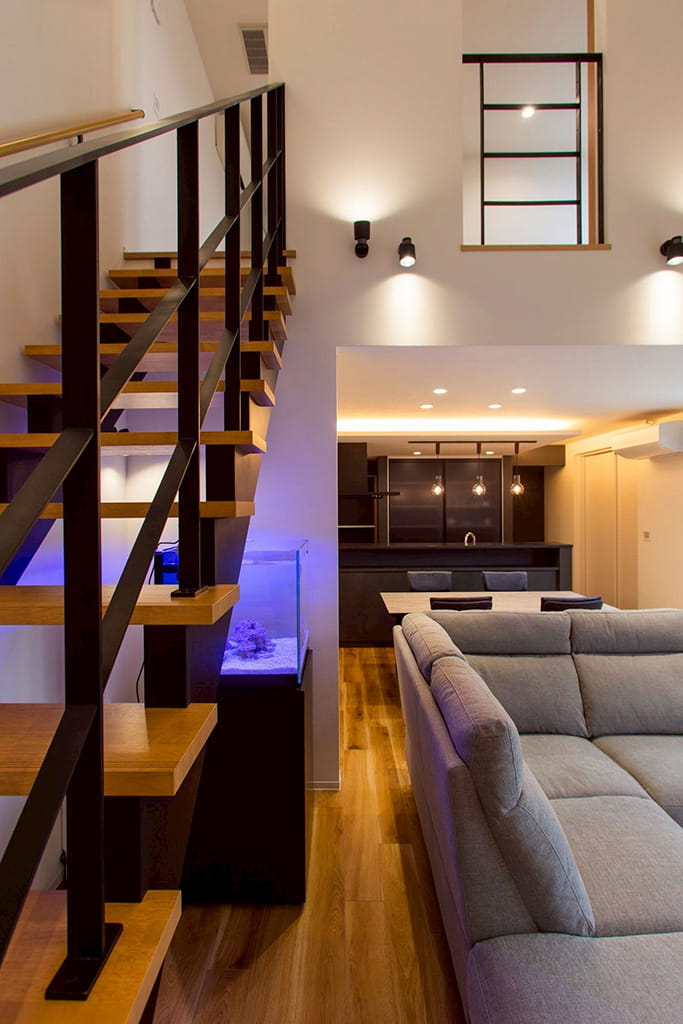 視線が上下に抜けるリビングは、鉄骨階段とアイアン手すりが