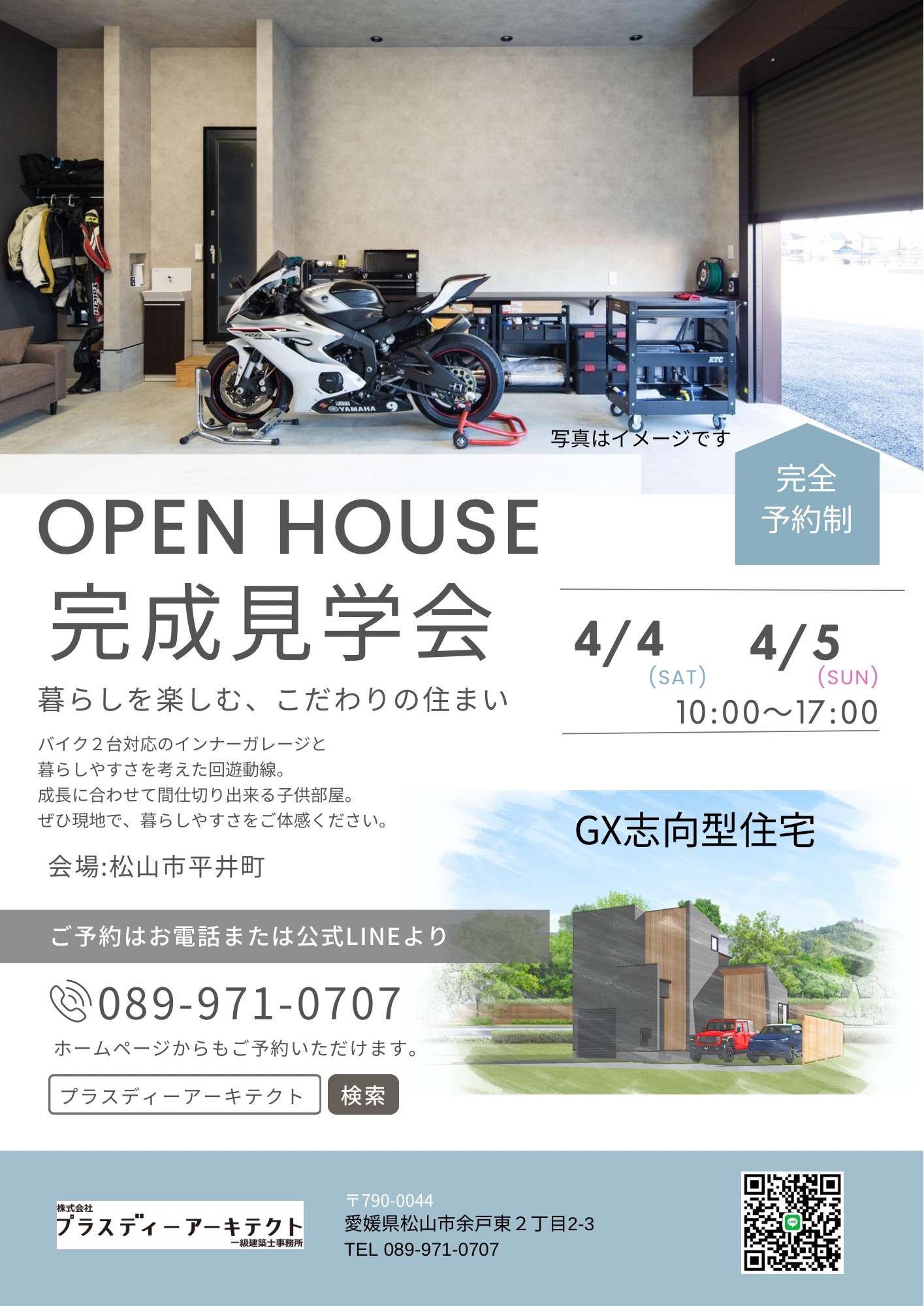 2026-02-22 完成内覧会のお知らせ 松山市平井町にて完成内覧会を開催致します。今回のおうちは「暮らしを楽しむ、ガレージハウス」!★バイク2台対応インナーガレージ★暮らしやすさを考えた家事楽動線★リビングに畳コーナー★成長に合わせて間仕切りできる子供部屋★太陽光7.92KW★許容応力度計算、耐震等級3★制震ダンパー搭載★GX志向型住宅などなど見どころ満載のお家をぜひご覧ください。※弊社電話窓口もしくはメール、インスタDMでお問い合わせください。